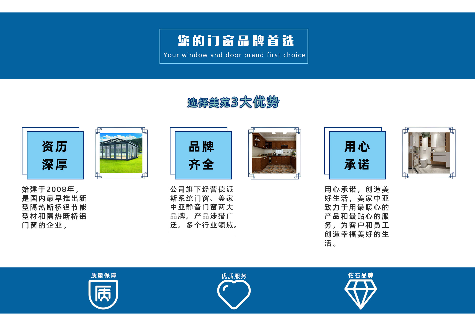 美家中亞(天津)科技有限公司前身為天津美苑斷橋鋁門(mén)窗有限公司,始建于2008年,是國(guó)內(nèi)早期推出新型隔熱斷橋鋁節(jié)能型材和隔熱斷橋鋁門(mén)窗的企業(yè)。公司旗下經(jīng)營(yíng)德派斯系統(tǒng)門(mén)窗、美家中亞靜音門(mén)窗兩個(gè)品牌,產(chǎn)品涉及斷橋鋁門(mén)窗、系統(tǒng)門(mén)窗、無(wú)縫焊接門(mén)窗、門(mén)窗建筑工程、智能家居、定制全鋁家裝設(shè)計(jì)等多個(gè)行業(yè)領(lǐng)域。用心承諾,創(chuàng)造美好生活,美家中亞致力于用暖心的產(chǎn)品和貼心的服務(wù),為客戶(hù)和員工創(chuàng)造幸福美好的生活。美家中亞,以客戶(hù)體驗(yàn)為使命,以產(chǎn)品品質(zhì)為根本,在低碳、環(huán)保、科技創(chuàng)新下,將好門(mén)窗帶入千家萬(wàn)戶(hù)!